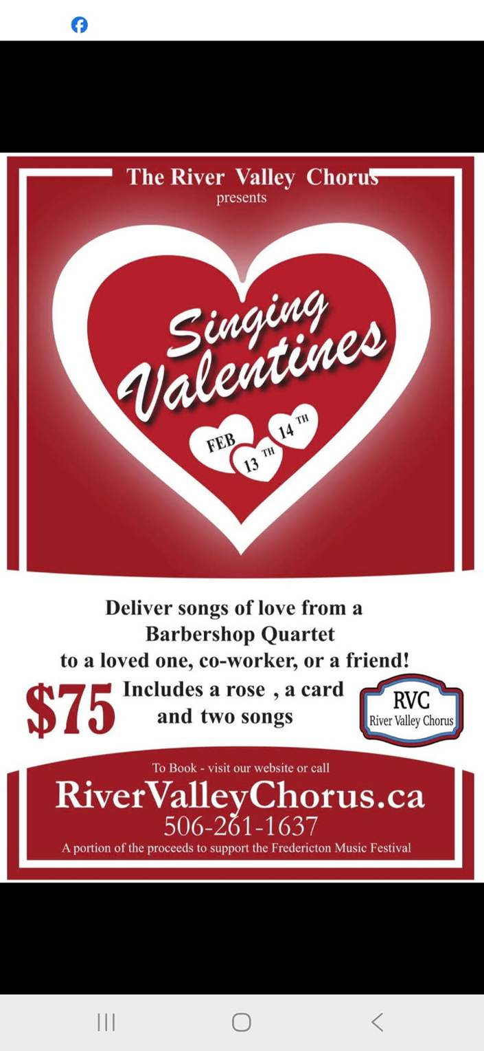 The River Valley Chorus is delivering Singing Valentines! Deliver songs of love from a Barbershop Quartet to a loved one, co-worker, or friend. Includes a rose, a card and two songs. $75. To book, visit RiverValleyChorus.ca or call 506-261-1637